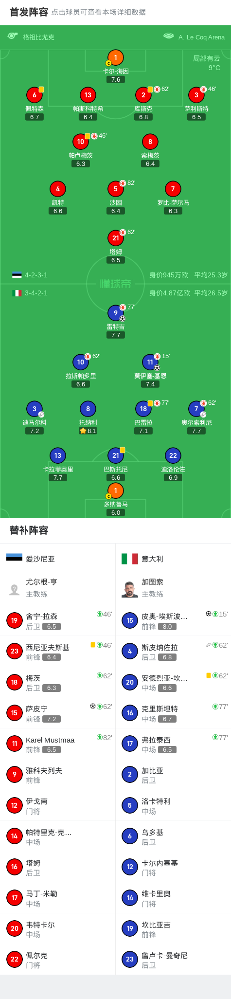 意大利3-1爱沙尼亚,皮奥首球,雷特吉破门+失点,多纳鲁马送礼